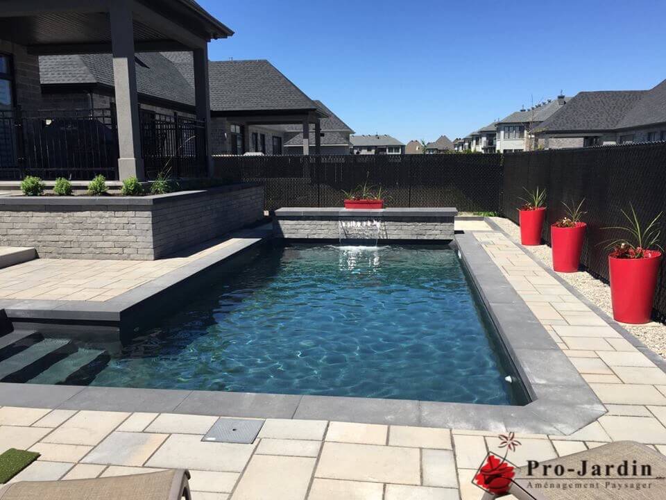 ← Previous Next → projet d’aménagement paysager pro-jardin paysagiste cours arrière piscine creusée contour de pavé-uni