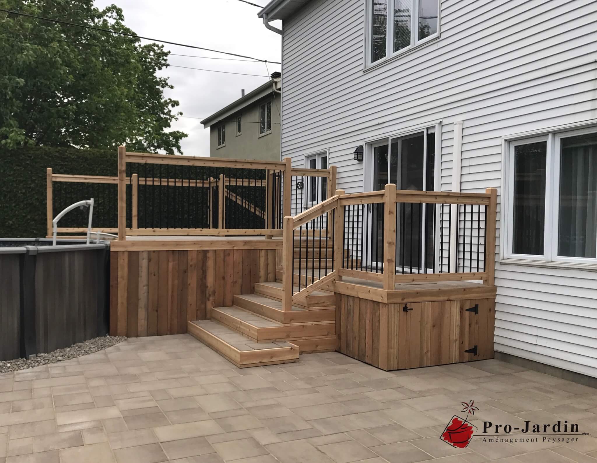 projet à boucherville avant et après réalisation d,une terrasse en bois et d’un patio en pavée uni terrasse pavé-uni réaliser par notre équipe de professionnel projardin pro-jardin paysagiste paysager aménagement paysagiste rive sud